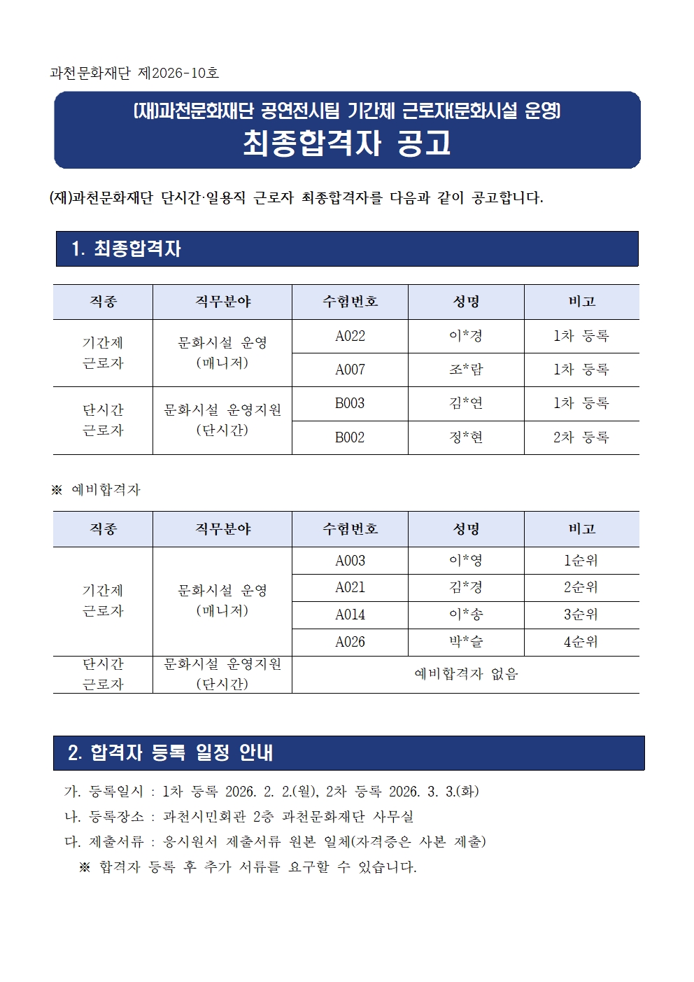 2026년 과천문화재단 기간제 근로자 최종합격자 공고(문화시설 운영)