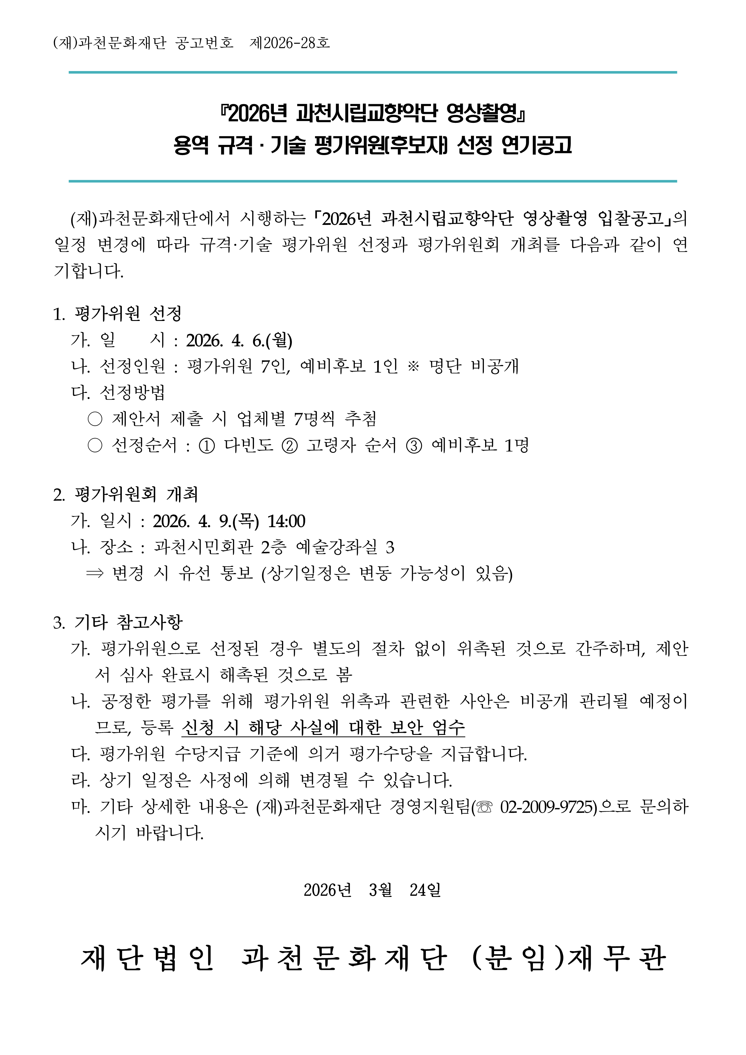 2026년 과천시립교향악단 영상촬영 용역 규격·기술 평가위원 선정 연기공고