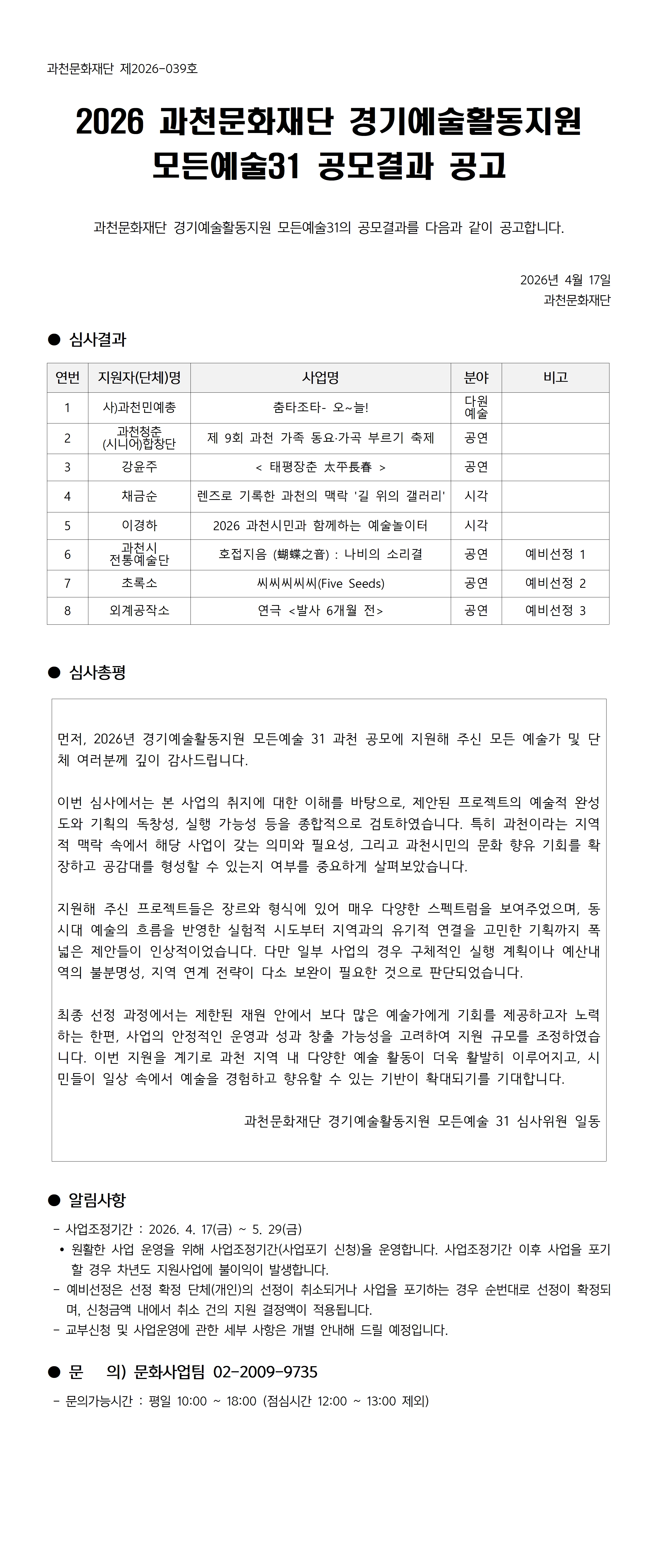 2026 과천문화재단 경기예술활동지원 모든예술31 공모결과 공고