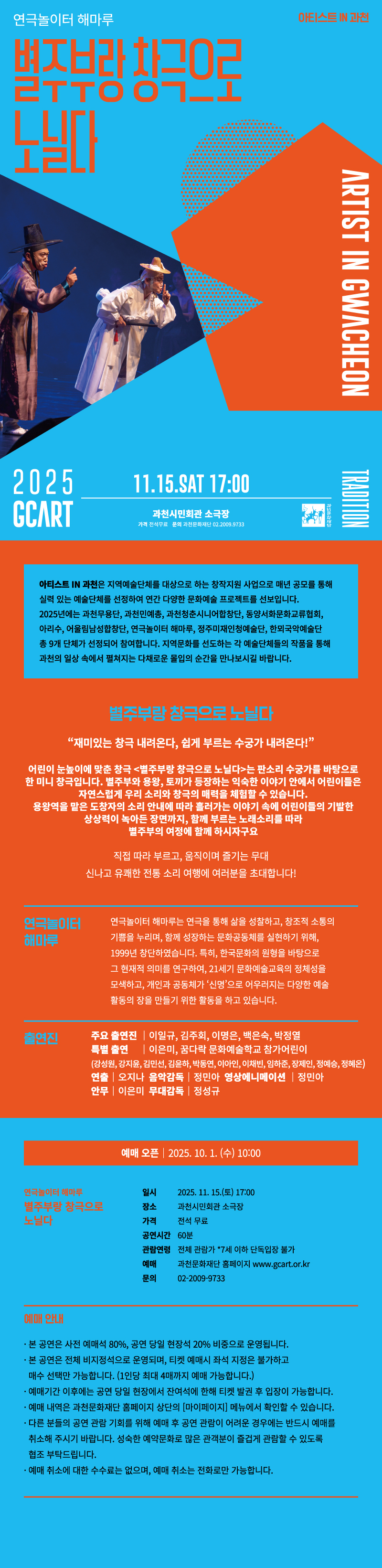 - 전화나 인터넷 예매 후 현장 매표소에서 티켓 수령 시 예약자명과 연락처를 제시해야만 예매한 티켓을 받을 수 있으며, 만약 이 정보를 정확하게 제시하지 못 할 경우 공연 관람에 지장을 초래할 수 있으며, 이에 대한 책임은 재단이 지지 않습니다.