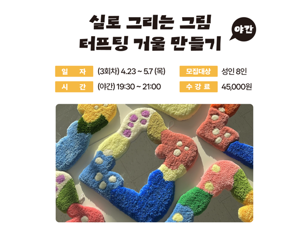 | 1 | 4.23.(목) 19:30 ~ 21:00 | 황희원 | - 오리엔테이션 & 터프팅 시연