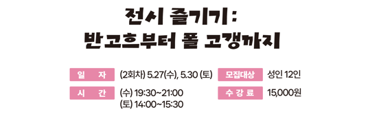 | 2 | 5.30.(토) 14:00 ~ 15:30 | 박제정 | - 전시회를 함께 보면서 1회차 때 다른 내용을 중심으로 좀 더 깊게 작가와 그 작가들의 작품에 대해 이해하는 시간을 가집니다. | 필기도구 |