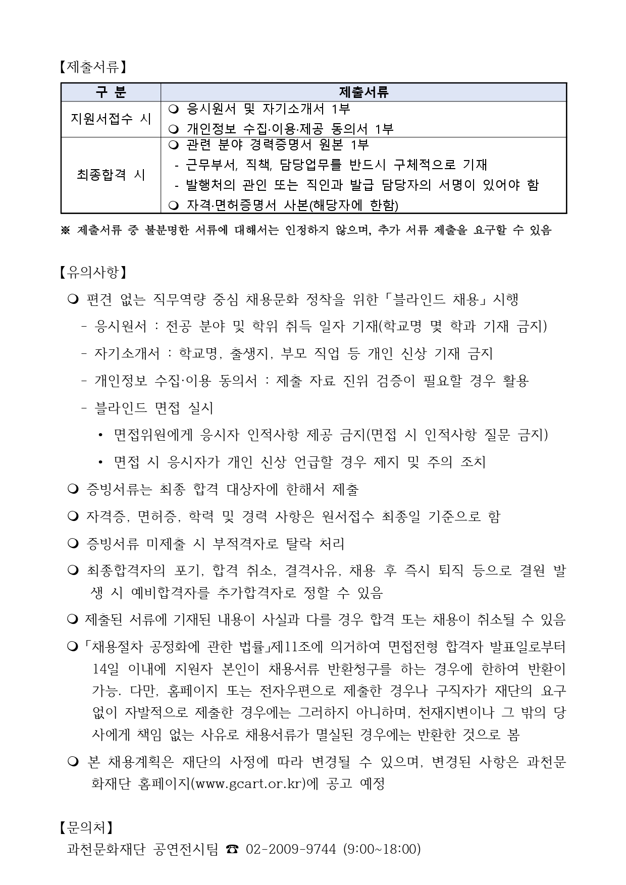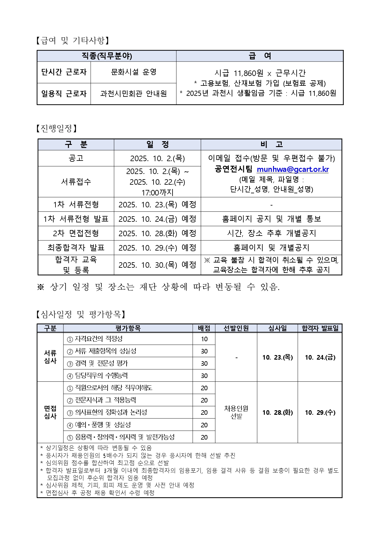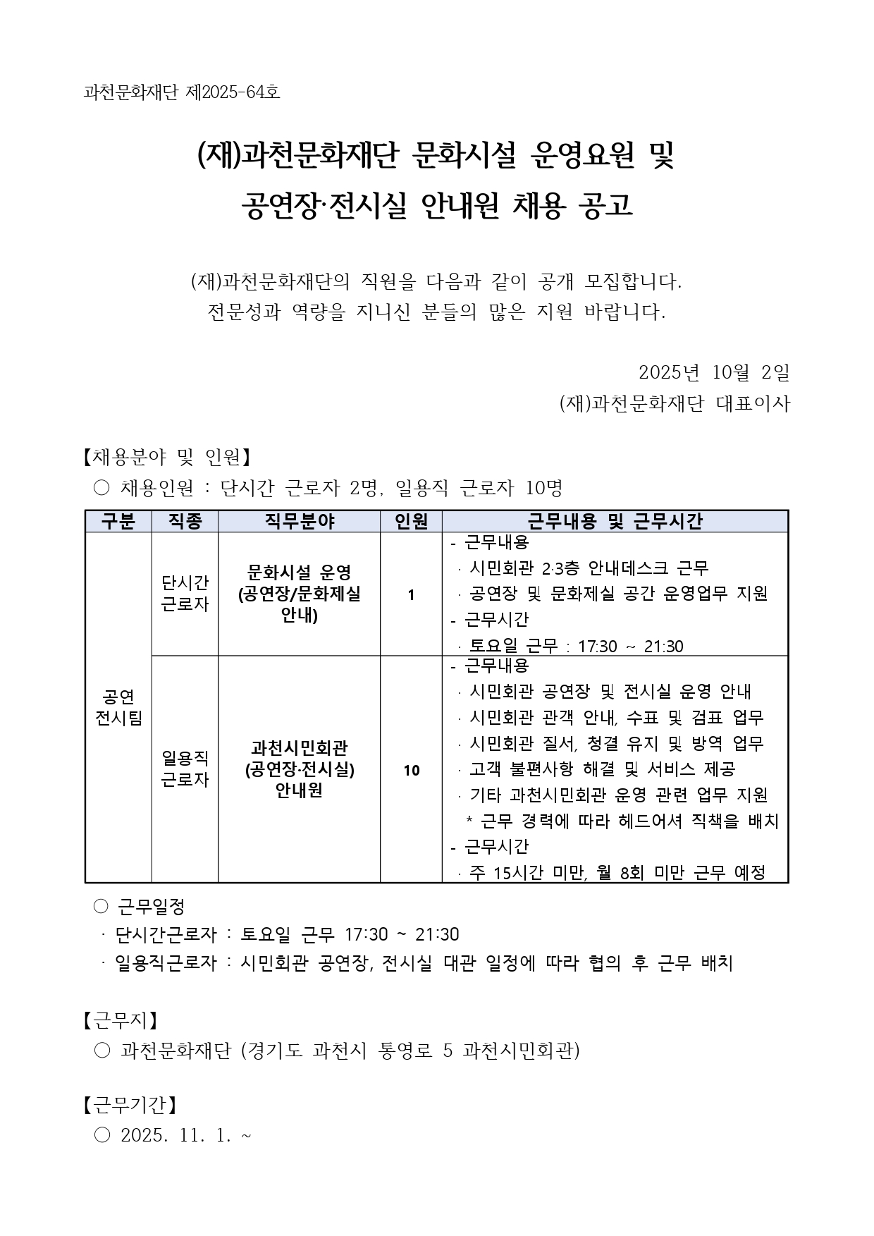 2025 과천문화재단 단시간(문화시설운영) · 일용직(하우스어셔) 근로자 5차 채용 공고